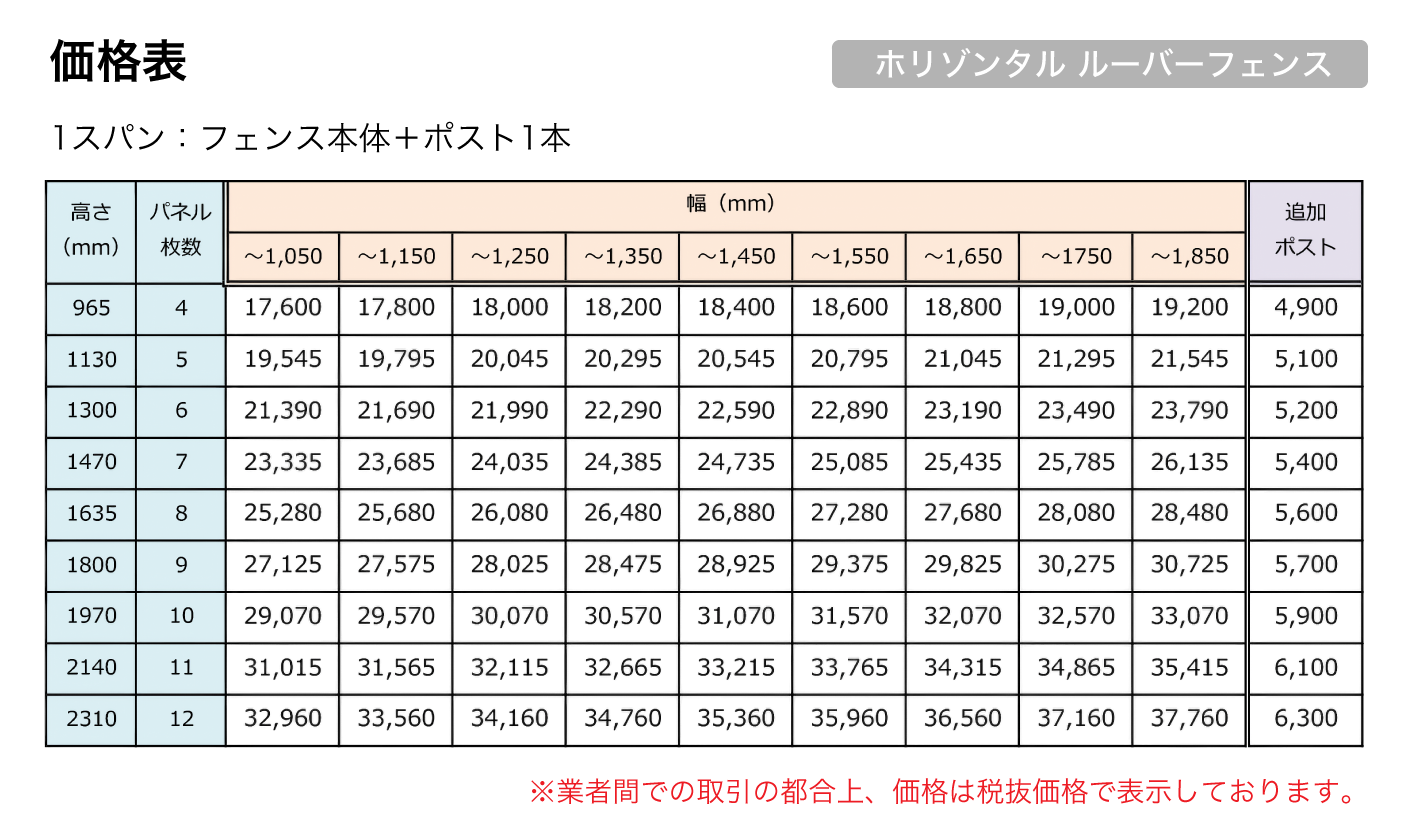 ホリゾンタルルーバーフェンスのみ、横幅1850mmまでの制約があります。これ以上、幅が長いとたわみが出る可能性があるためです。
